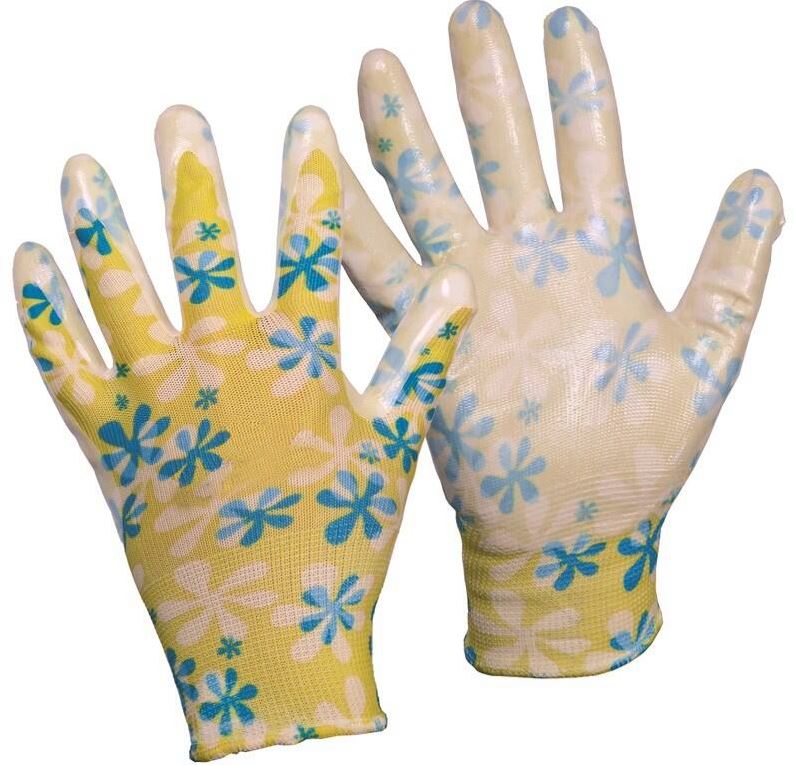 Bezszwowe dziane rękawice z nadrukiem, dłoń a palce maczane w gładkim nitrylu, elastyczny mankiet. Opakowanie z blistrem.